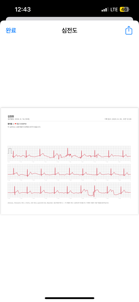 워치를 이용한 심전도로는 리듬이 규칙적인지, 빠른지 느린지 정도의 정보만 얻을 수 있습니다. 심근경색의 가능성은 없어보이나 불편감이 지속되고 불안하시니 내과를 방문해보시기 바랍니다.