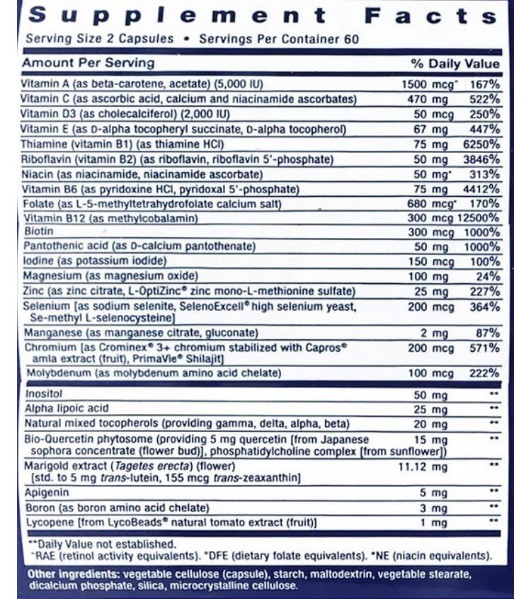 (A- 7500iu / C- 120mg/ D3- 1000iu/ E- 100iu/K1- 100mcg/ B1- 25mg/ B2- 25mg/ 나이아신- 50mg/ B6- 40mg/ 엽산- 800mcg/ B12- 225mcg/ 비오틴 - 325mcg/ 판토텐산40mg/ 아이오딘 150mcg/ 마그네슘 100mg/ 아연- 15mg/ 셀레늄- 250mcg/ 구리- 2mg/ 망가니즈- 5mg/ 몰리브데넘- 75mcg