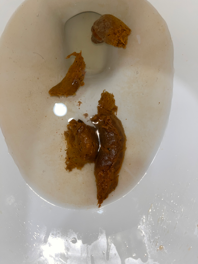 아주 정상적인 변입니다. 걱정하실것 하나도 없습니다. 색깔이 어두운 것도 아니에요. 문제가 될수 있는 변은 자장면 국물같은 변이 나오는 겁니다.