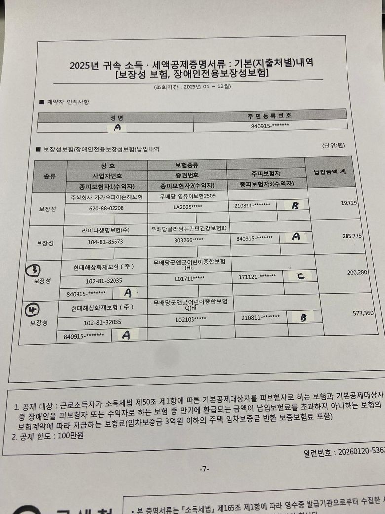 보장성 보험료 동그라미 3,4의 금액을 반영해도 되나요?