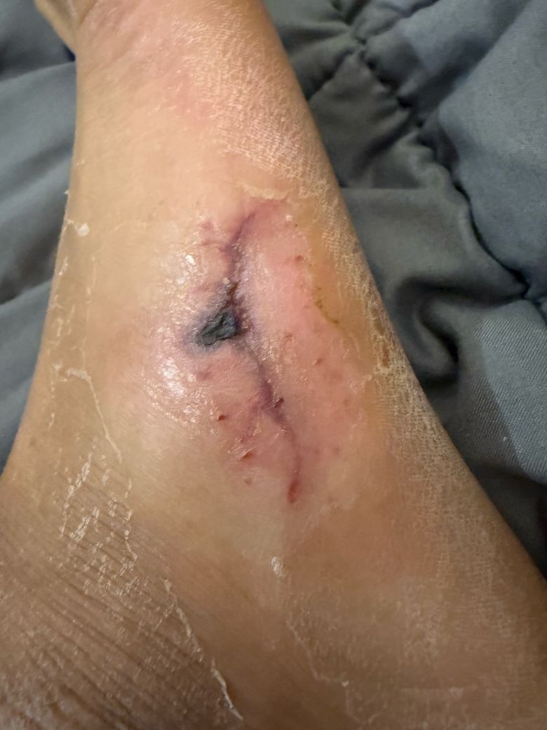 1월29일 겉에 살 괴사해서 조금 도려냈음 통증이나 진물은 없고 검은부분은 딱지처럼 딱딱해요 주변은 살짝 빨게요 처음사진은2월17일날 샤워후 딱지가 떨어진상태고 두번째는 2월24일 마지막은 2월25일 현재상태인데 발을 좀 많이쓰면 흉터색이 진해져요 잘 아무고있는걸까요?? 겉에하고 봉합부위가 색이 진해져서 걱정되네요ㅜㅜ