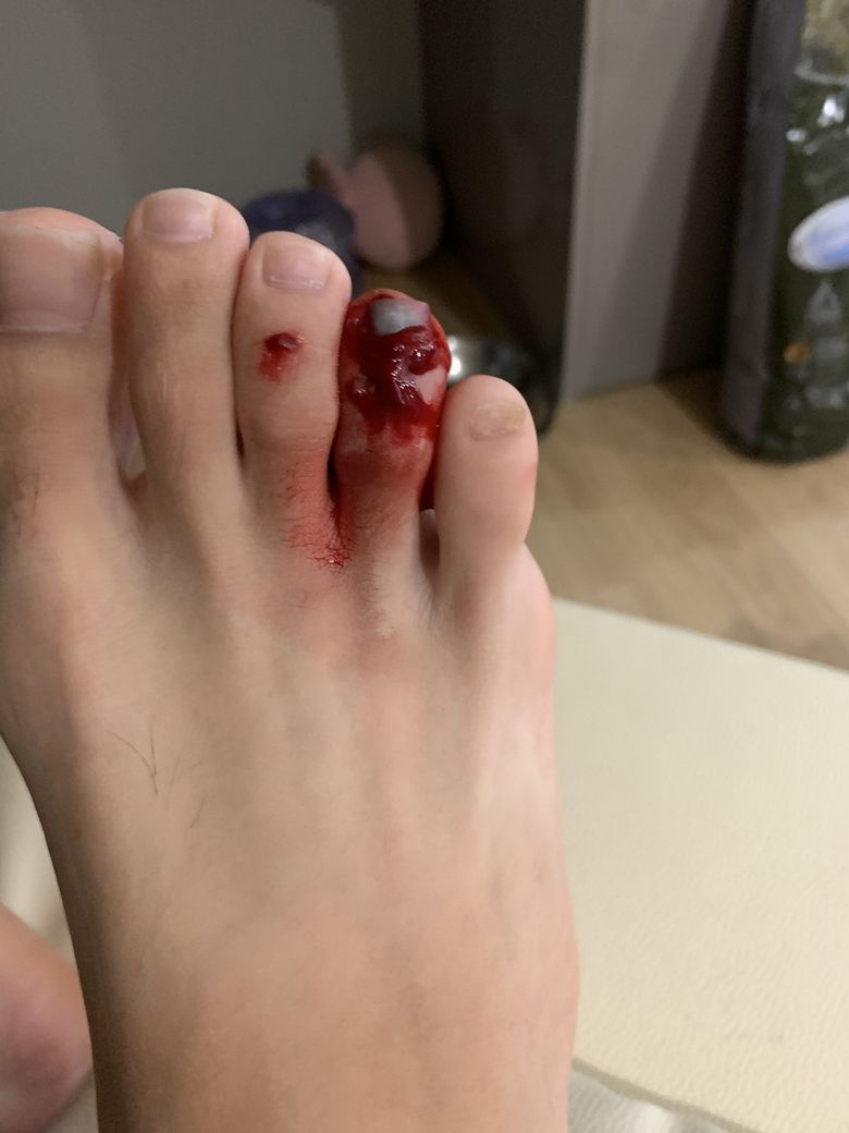 전날 밤에 무거운 물건을 떨어뜨려 발가락을 다쳤습니다.