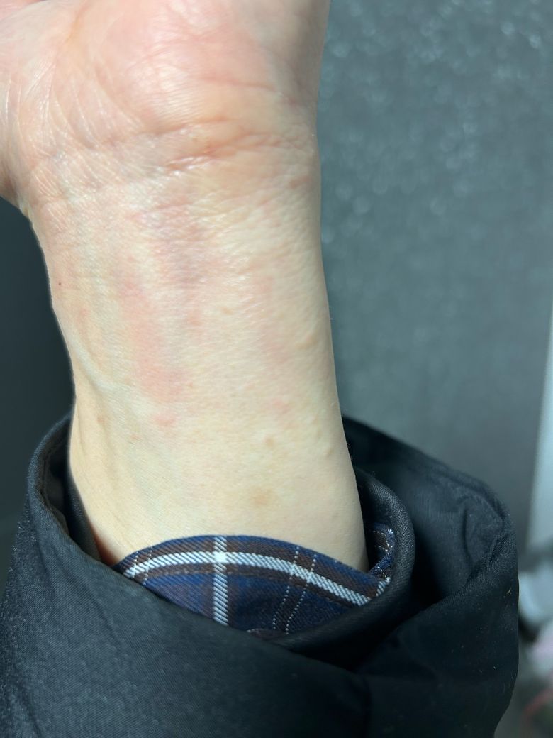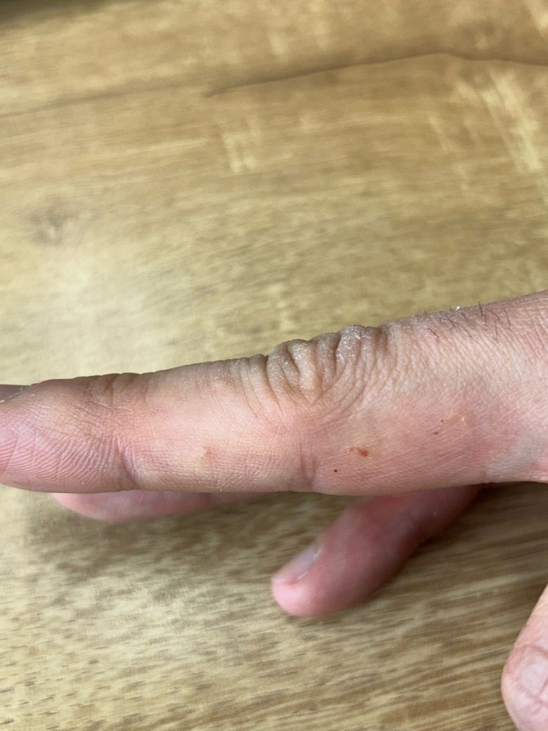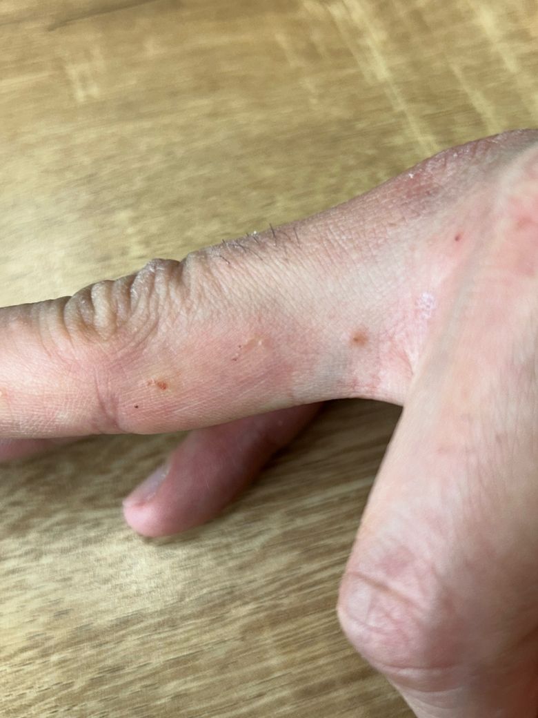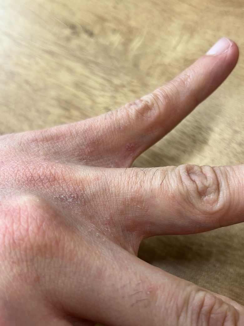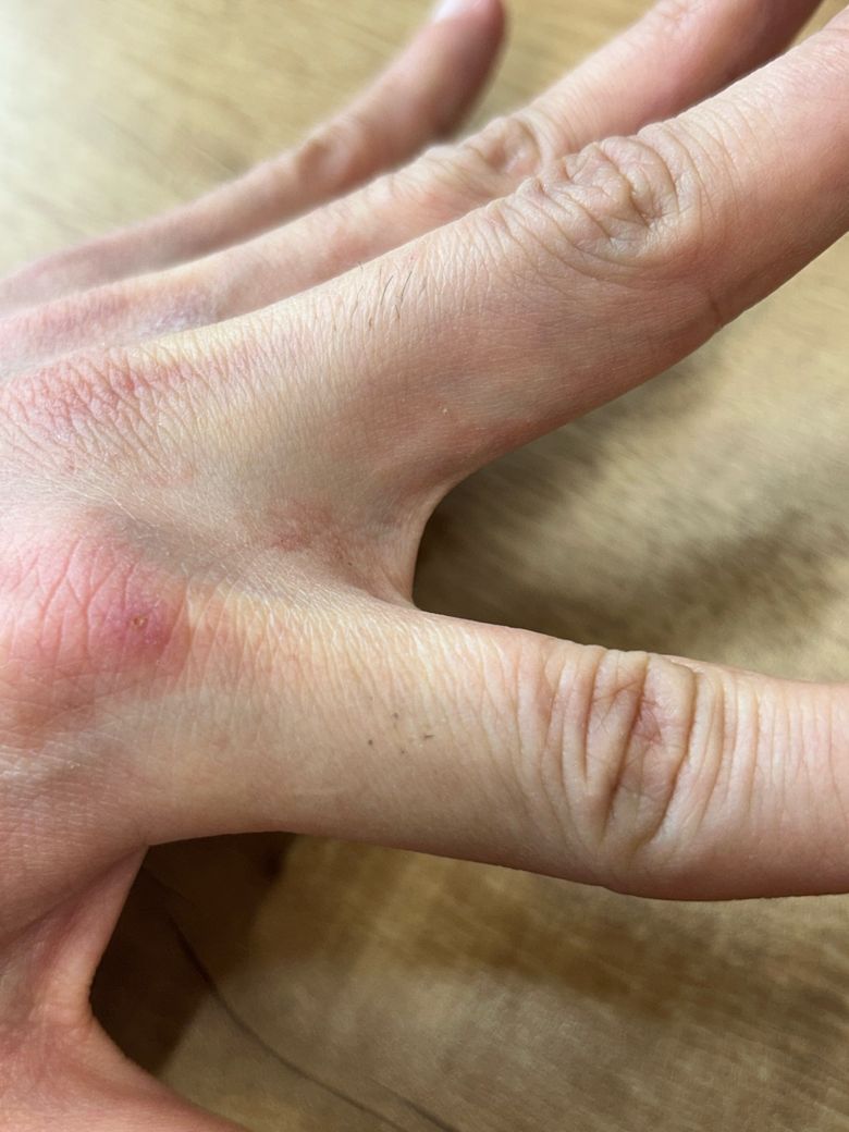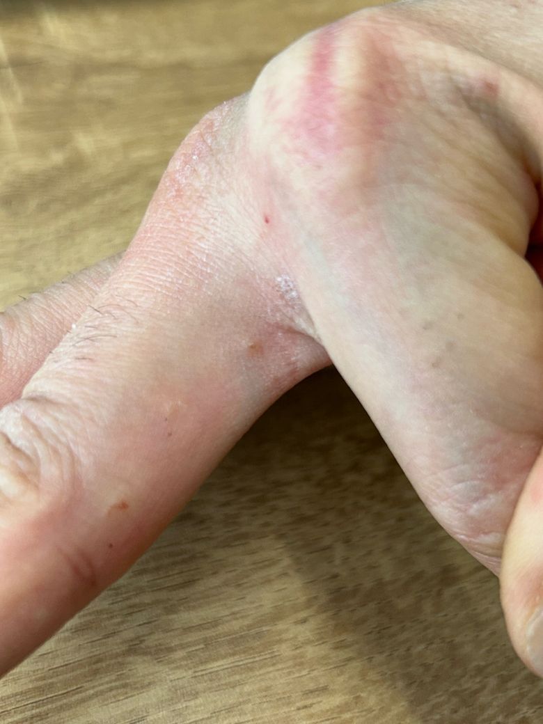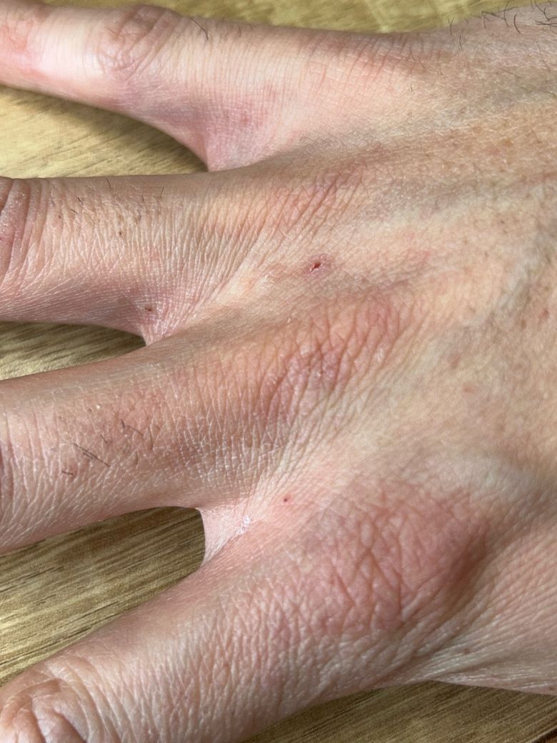 옴 진드기라면 지속적으로 가려울 겁니다. 현재 피부가 건조해 보이고 약간의 수포처럼 보이는 발진도 관찰되는 것 같습니다. 피부 건조부터 해결하는 것이 좋을 것 같아요. 보습제를 열심히 바르시고 물이나 세제에 노출되는 것은 최대한 피해 보시기 바랍니다.