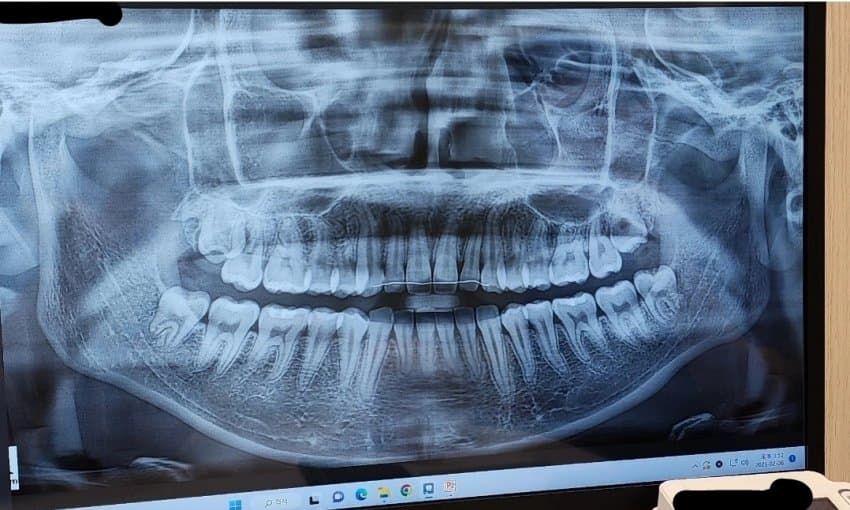 이정도면 정상적인 치근 사이즈라고 보면 됩니다. 재교정 필요하다면 하시면 됩니다. 윗니 앞니 안쪽에는 교정 유지장치가 부착되어 있습니다.