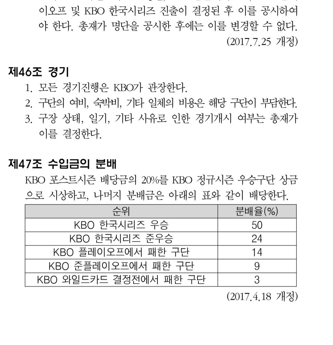 참고로 질문에 언급하신 구단에서 주는 포상금 금액도 제한이 있습니다. 구단이 배정받은 포스트시즌 배당금의 50%를 넘길 수가 없습니다.