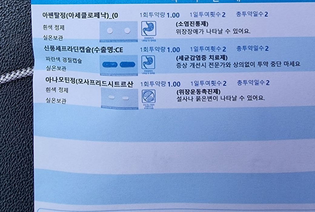 칼로 손이 베여서 봉합 후 소염진통제, 항생제, 위장약을 처방 받으셨는데.