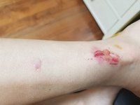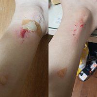 상처가 나고 출혈이 나고 있다면 깨끗한 흐르는 물에 씻은 다음 베타딘(빨간약)으로 소독해주시고 후시딘이나 에스로반 같은 항생제 연고를 바르고 위에 거즈나 메디폼으로 덮어주시면 됩니다. 상처가 크다면 집에서 처치하시기 힘드실 수 있으니 병원에 가셔서 관리를 받으시길 바랍니다.