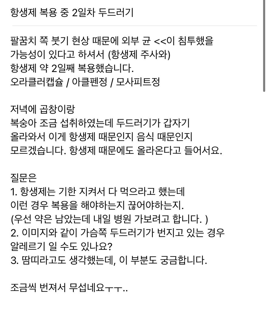 항생제 복용중인데 두드러기가 올라와요.(외부 균 침투 때문에 팔꿈치 붓는 현상) 복용중인 항생제를 마저 먹어야하는지 나둬야하는지 모르겠습니다. 중간에 끊으면 더 안좋다고 들어서요…