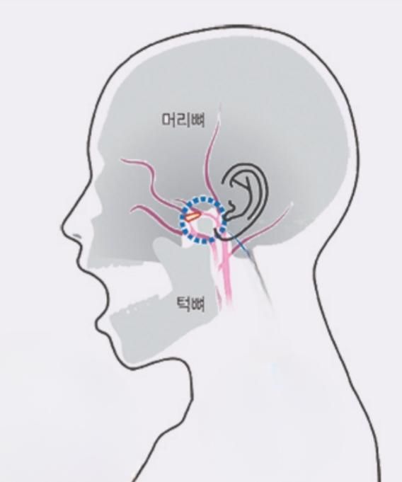 머리뼈랑 아래턱뼈가 만나서 관절을 이루는 귀 앞 부위(사진의 파랑 동그라미)가 아프고 불편해요.