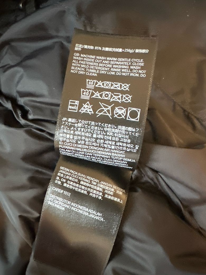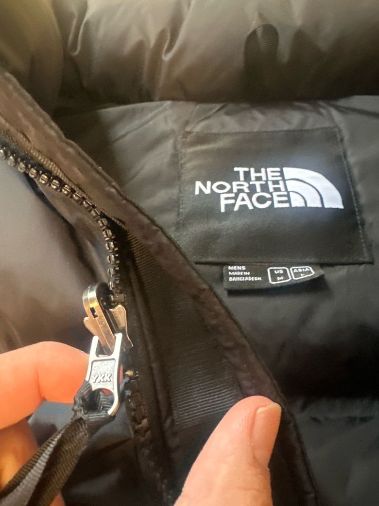 택, 로고 자수, 지퍼, 충전재 표기, 마감 디테일 등을 종합적으로 확인해야 합니다. YKK 지퍼와 700 표기는 맞지만, 이것만으로는 정품 여부를 확정하기 어렵습니다. 특히 안전한 경로가 아니라면 가품 가능성도 배제할 수 없습니다