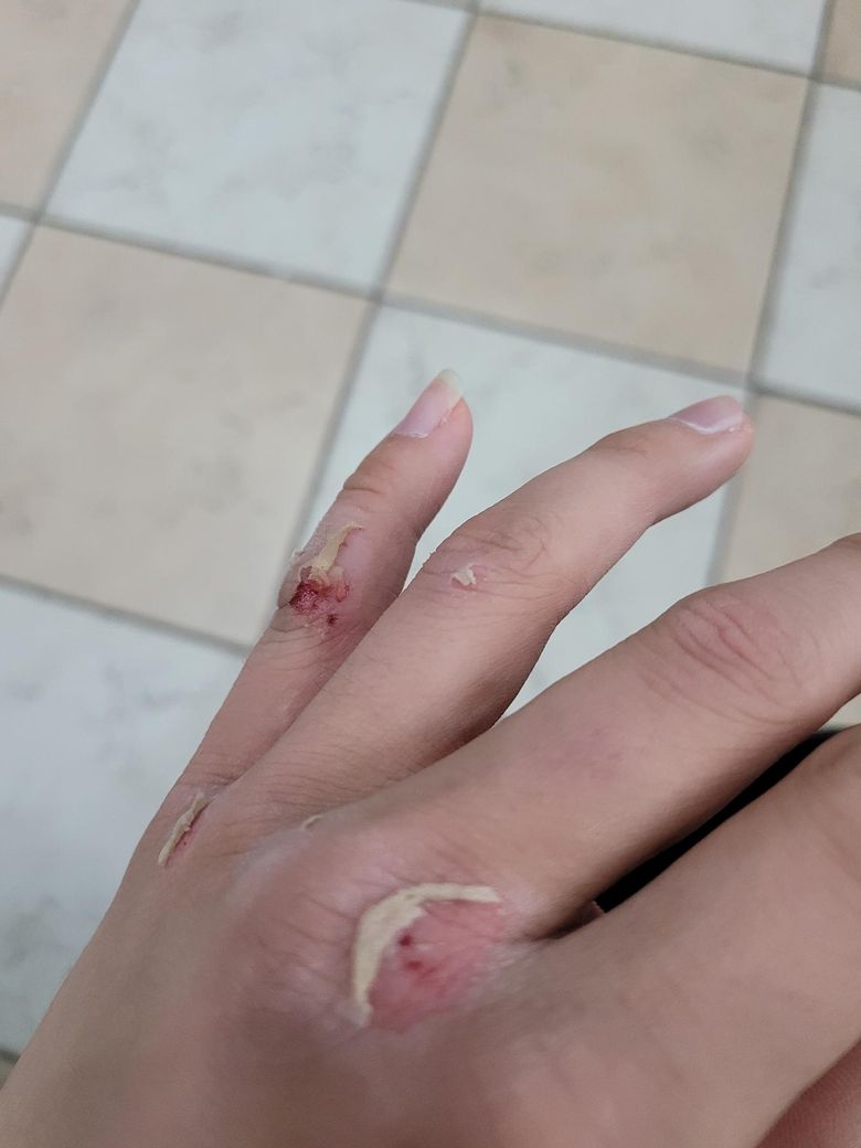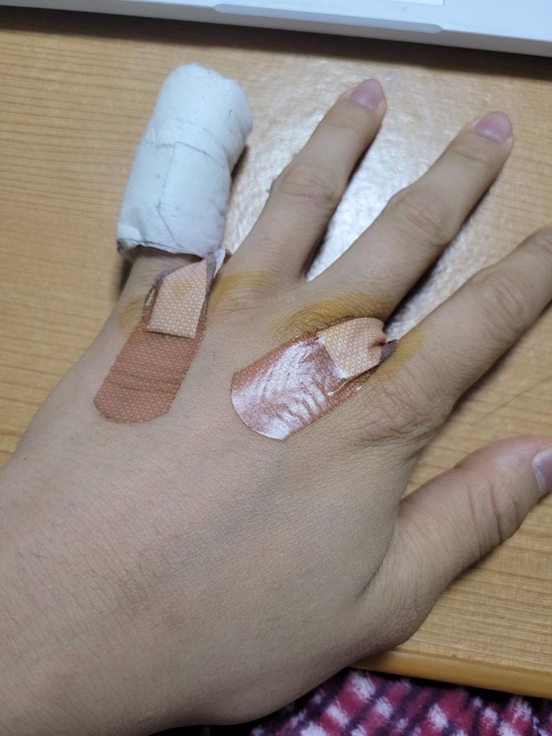 둘째, 넷째 손가락 사이의 다친 상처의 경우에는 깊이가 깊지 않아 대일밴드만 매일 교체하여 주시고 딱지가 앉았다면 그냥 생활하셔도 될 것으로 보입니다.