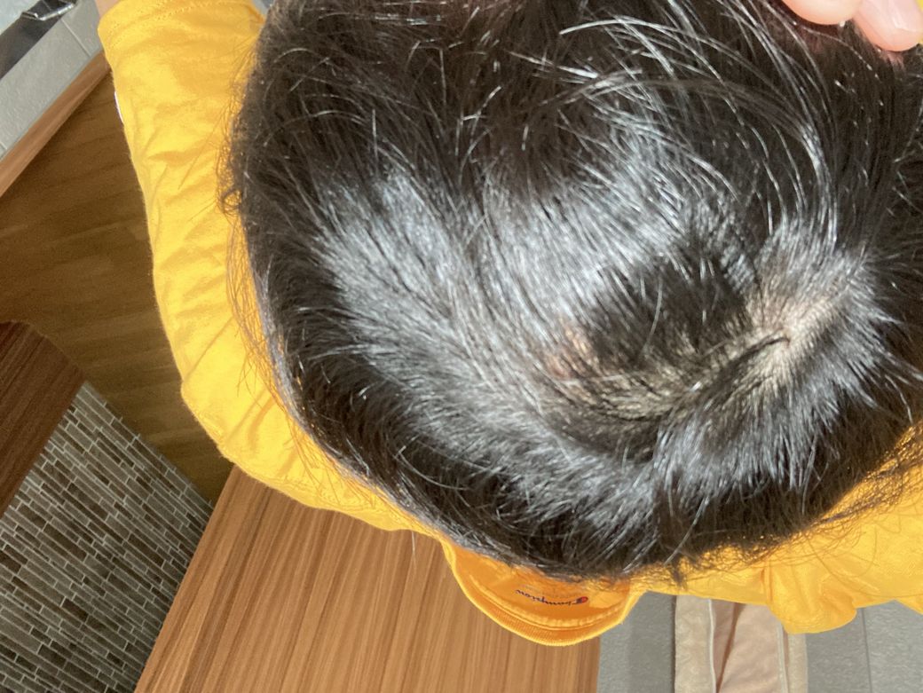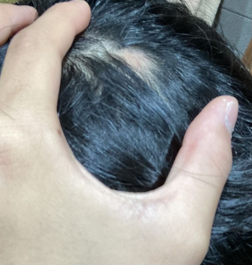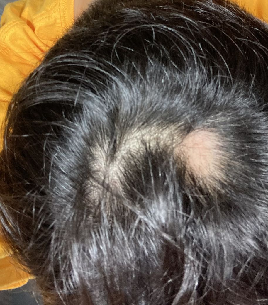 정수리 부분에 원형 탈모가 생긴 상태로 머리카락이 없어지면서 두피 그대로를 느끼는