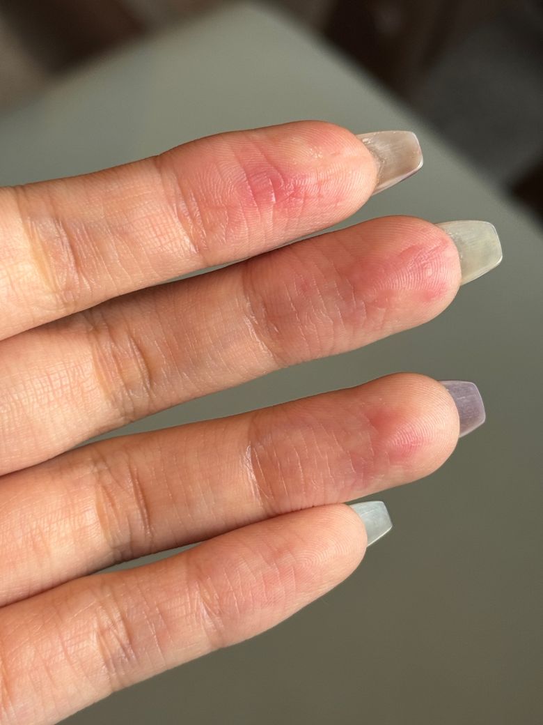 사진상으로는 손가락 마디와 끝부분에 국소적인 홍반이 보이지만, 각질·수포·진물·균열은 뚜렷하지 않고 통증이나 가려움도 없다고 하셨습니다.