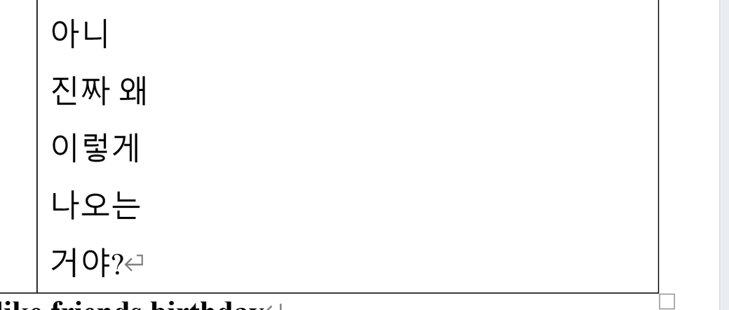 워드 타이핑 치고 있는데 pdf 파일을 워드로 전환해서 표에 작성하고 있는데 전부가 그런건 아닌데 일부 표 안에서 글자가 조금 길거나 스페이스를 치면 다음줄로 자동으로 내려갑니다. 이거 어떻게 정상적으로 바꾸는지 궁금합니다.