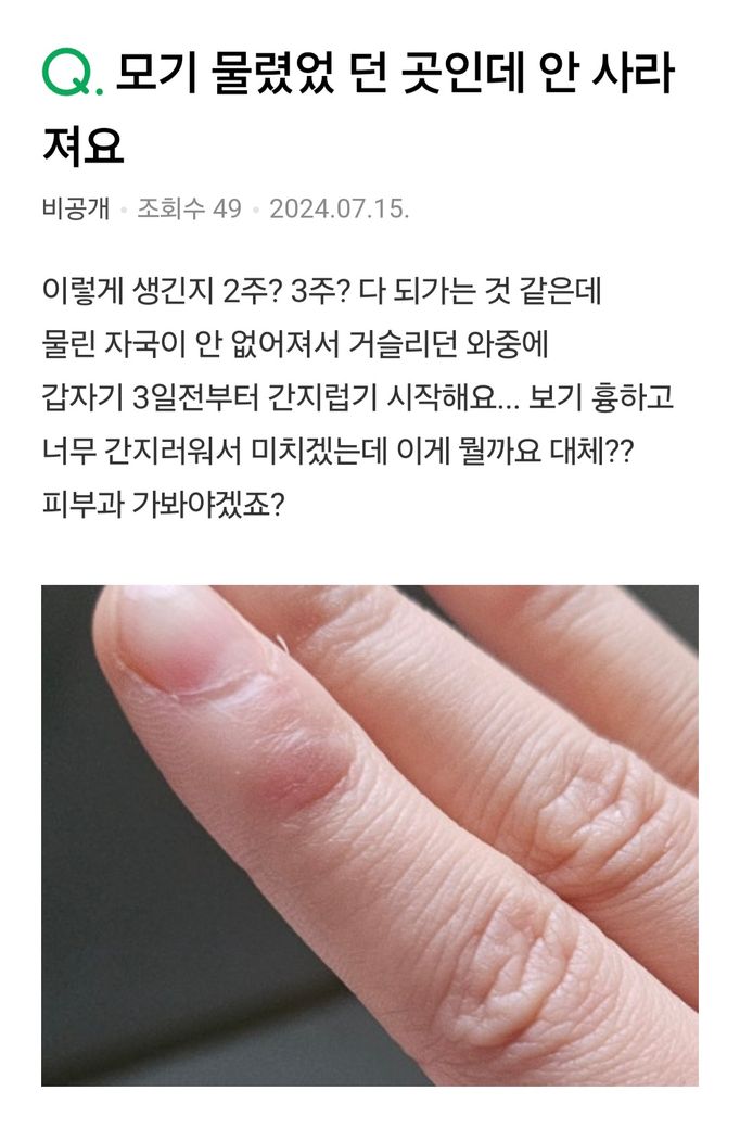 2~3주동안 부어있다가 갑자기 미친듯이 간지럽더라구요 그래서 병원에 갔더니 그냥 단순 벌레물림이라고 하셔서 스테로이드 연고 처방받고 일주일 발라줬더니 가렵지는 않았지만