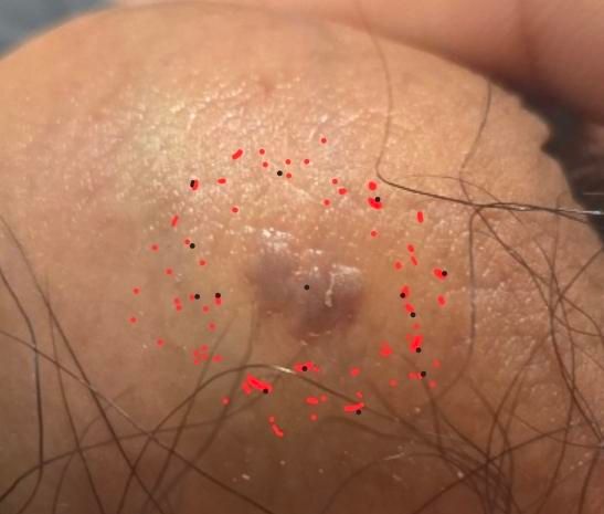 병변 생성 20일정도 후 두번째 사진처럼 병변 주위에 많은수의 빨간 작은 뾰루지같은게 났고 다음날에 보면 검정딱지 같은게 있었고 샤워하면 대부분 떨어져 나갔습니다.