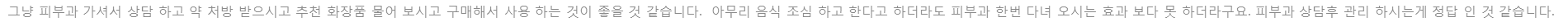 그냥 피부과 가셔서 상담 하고 약 처방 받으시고 추천 화장품 물어 보시고 구매해서 사용 하는 것이 좋을 것 같습니다. 아무리 음식 조심 하고 한다고 하더라도 피부과 한번 다녀 오시는 효과 보다 못 하더라구요. 피부과 상담후 관리 하시는게 정답 인 것 같습니다.