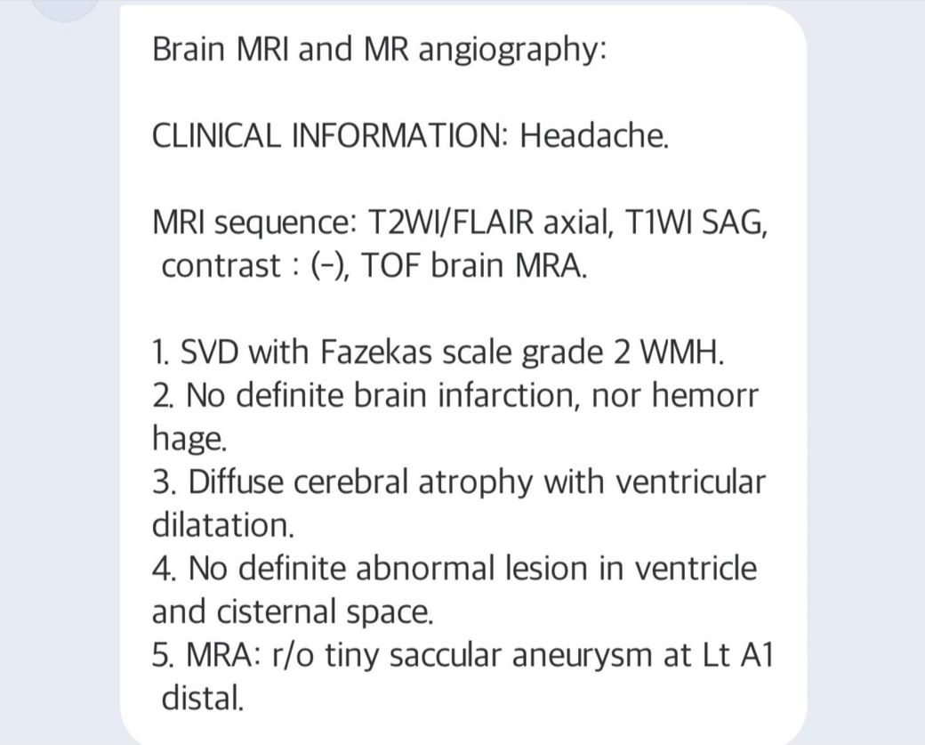mri, mra 촬영 결과 뇌동맥류 의심 소견