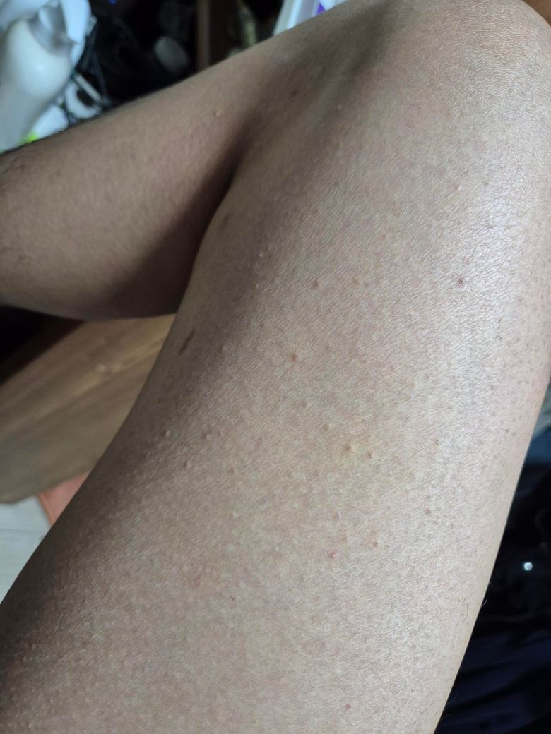 사진상 허벅지 병변은 전형적인 얼굴·등 여드름보다는 모낭염이나 모공각화증 양상이 더 의심됩니다. 작은 균일한 돌기 위주이고 염증이나 고름이 뚜렷하지 않다면 여드름 계열과는 경과와 치료가 다를 수 있습니다.