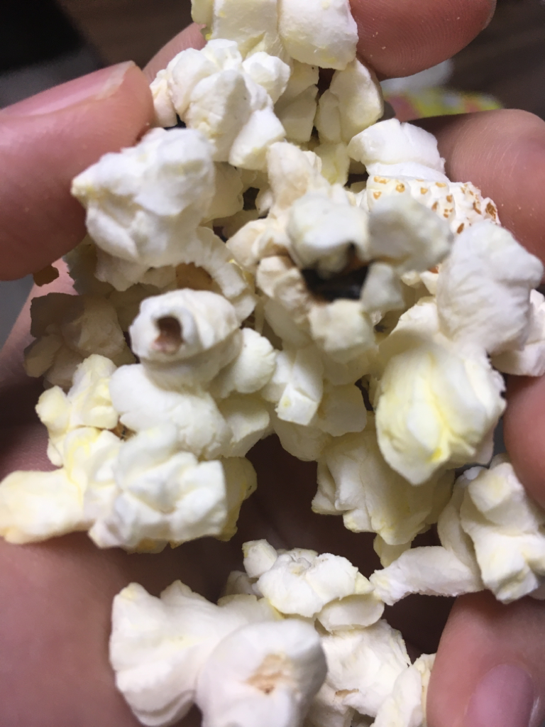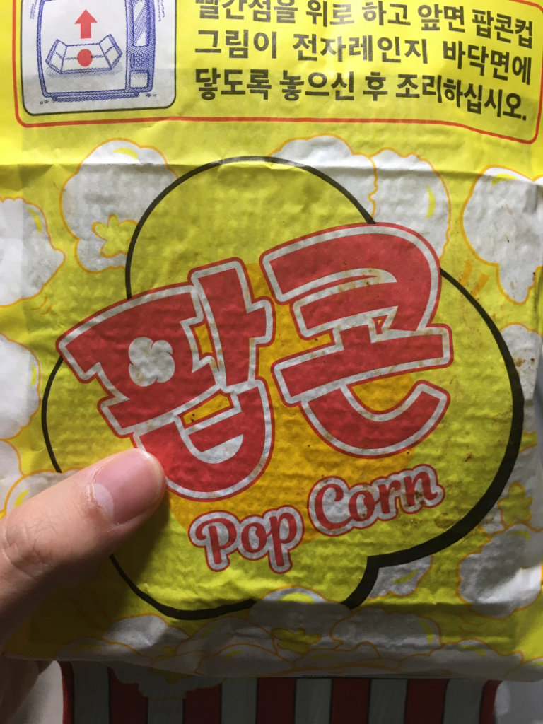 처음에 전자레인지에 돌리고 났을때 조금 탄내가 나서 먹을까 말까했는데 사진처럼 팝콘 하얀 부분이 탄건 아니고 안쪽에 부분이 원래 노랗거나 갈색이여야 하는데 그게 좀 타서 검은색 이였습니다.