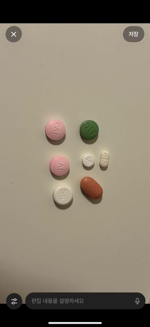 양의 한쪽 단면만으로 약의 성분이나 정확한 제품명을 알기는 어렵습니다. 되도록이면 조재을 받은 약국에 문의를 하시는 게 좋아 보입니다.