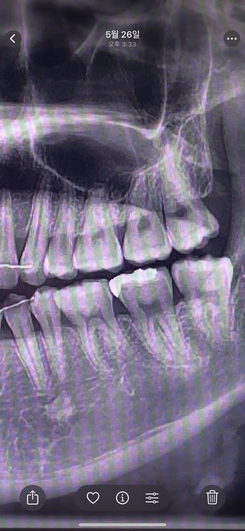 엑스레이 상으로는 크게 문제가 잇어 보이진 않습니다. 씹는면은 교모가 되면서 구멍이 생겻을 수도 있습니다.