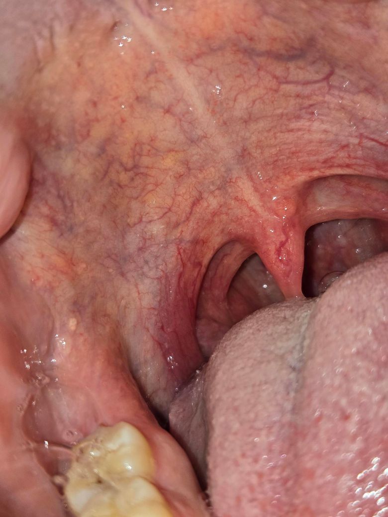 사진에서 보이는 병변은 목젖(구개수) 옆 점막에서 줄기처럼 달려 움직이는 작은 돌기 형태로 보입니다. 설명하신 “건드리면 유연하게 움직이는 혹”이라는 특징을 보면 임상적으로는 구강 내 섬유종(fibroma) 또는 점막 유두종(squamous papilloma) 형태가 가장 흔합니다. 두 병변 모두 구강에서 비교적 흔한 양성 병변입니다.