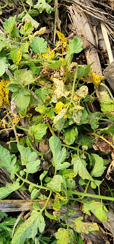 잎사귀에 많은 잎사귀 마름병같은 것이 생긴것 같습니다. 토마토 작물을 하고 계시는 범위가 크지 않다면 전체적으로 토양을 다시 고르시고 다시 심으시는 것이 좋을듯 합니다.