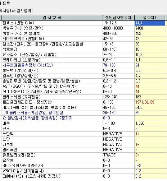 간수치가 상승했고 중성지방이 높고 단백뇨가 있네요