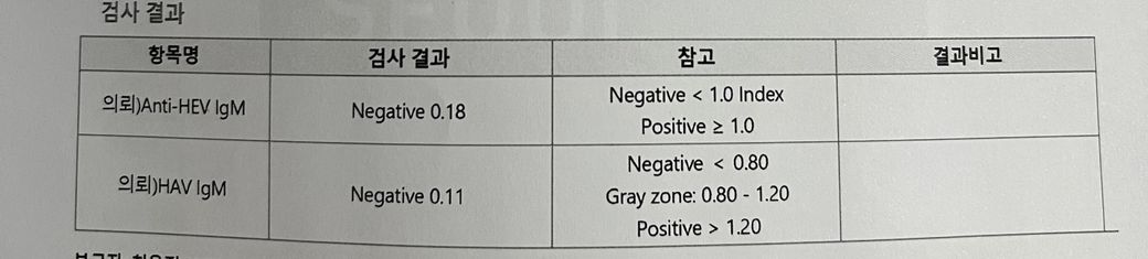 Anti-HEV IgM은 0.18로 음성이며, HAV IgM은 0.11로 역시 음성입니다. 참고로, Anti-HEV IgM의 경우 음성은 1.0 미만, 양성은 1.0 이상, HAV IgM의 경우 음성은 0.80 미만, 회색 영역은 0.80~1.20, 양성은 1.20 초과로 판단됩니다.