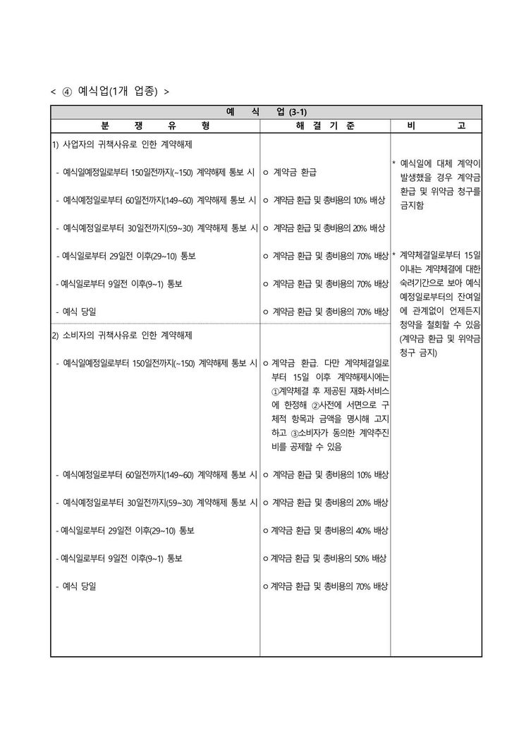 한국소비자원 소비자분쟁해결기준상 100일전 계약해제시 총비용의 10%의 배상이라고 명시되어져있는 자료를