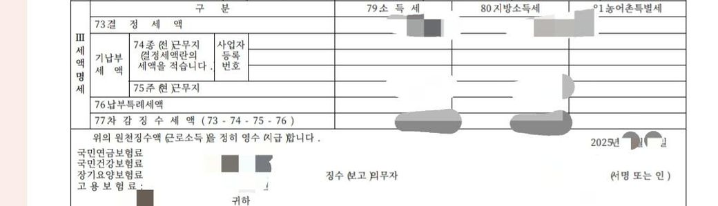 올해 중도퇴사하게 되어 원천징수영수증을 받았는데, 환급금으로 73번 결정세액 항목을 받아야하나요, 77번 차감징수세액 항목을 받아야하나요?