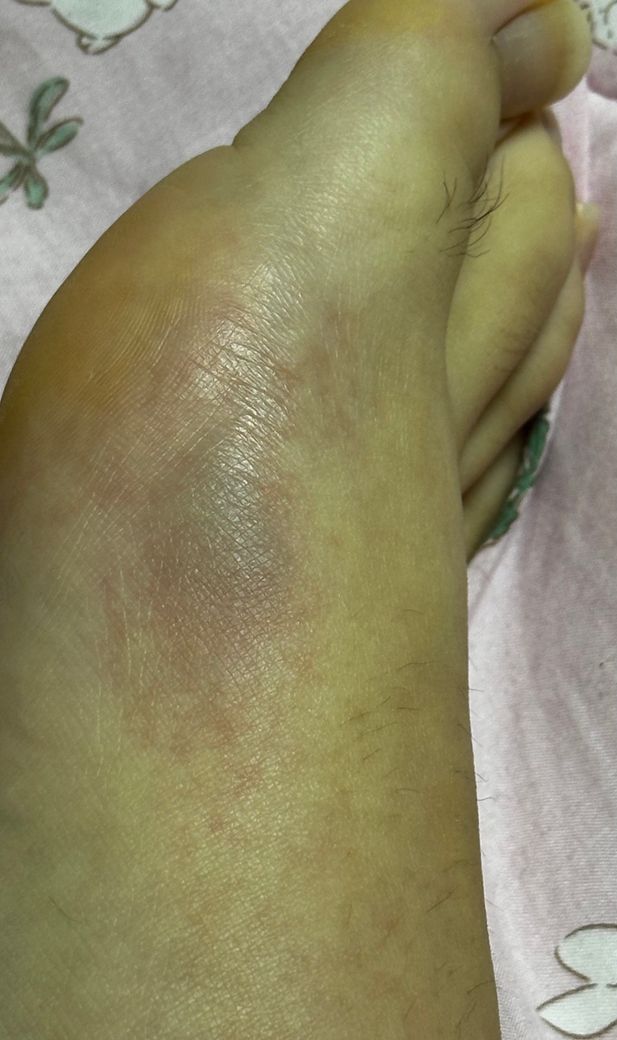 타박상이 발생하신 것으로 보이는데요, 타박상이 발생한 초기에는 아이스팩을 해주시면 통증과 염증반응을 완화할 수 있으므로 아이스팩을 해주시고, 발을 높게두어 휴식을 취하시는 것이 좋습니다.