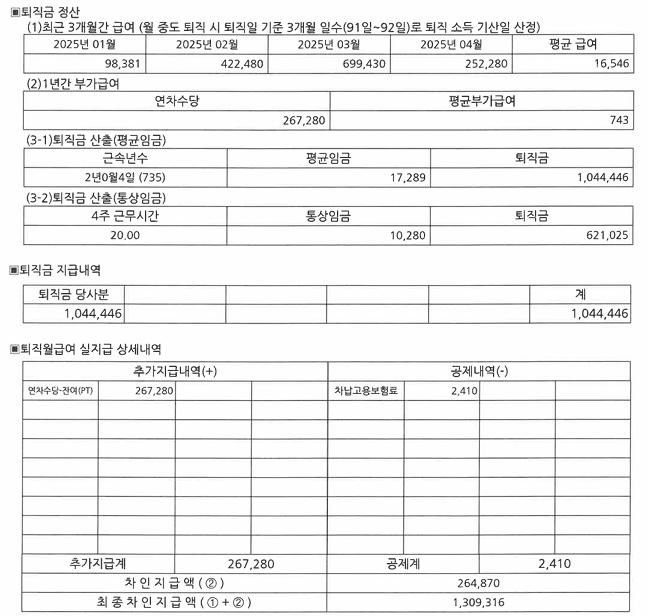 퇴직금 정산서의 ‘최근 3개월 간 급여 항목’과 연말정산용 '2025년 근로소득총액'을 비교해보니,