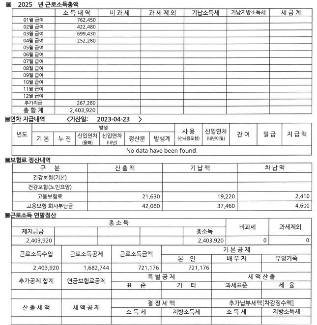 1월 급여는 정산서에는 98,381원으로 표기, 근로소득총액에는 762,450원으로 기재되어 있는 차이가 있습니다.