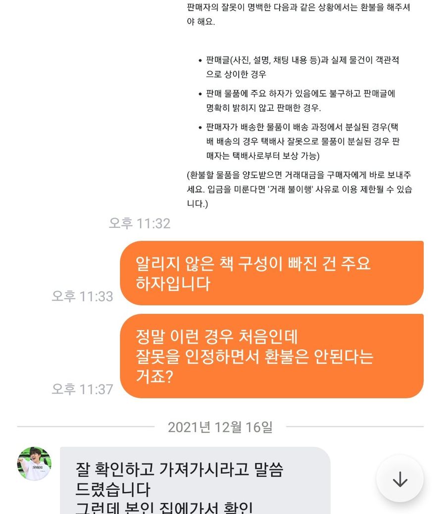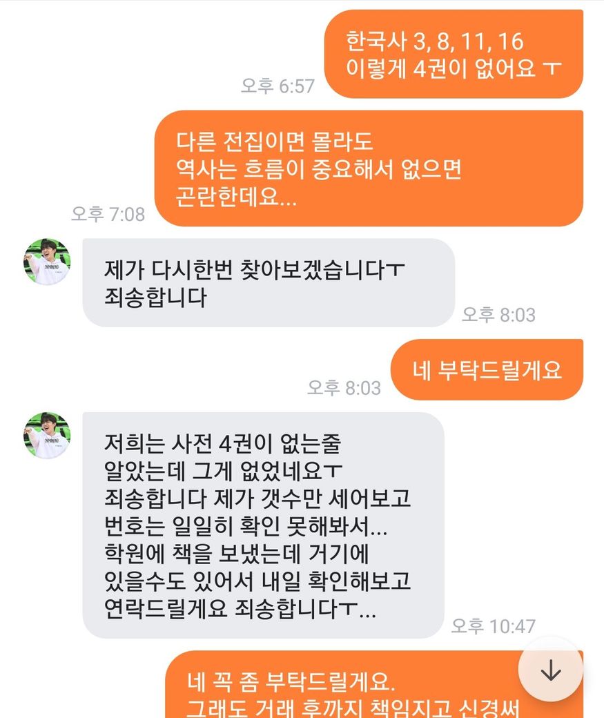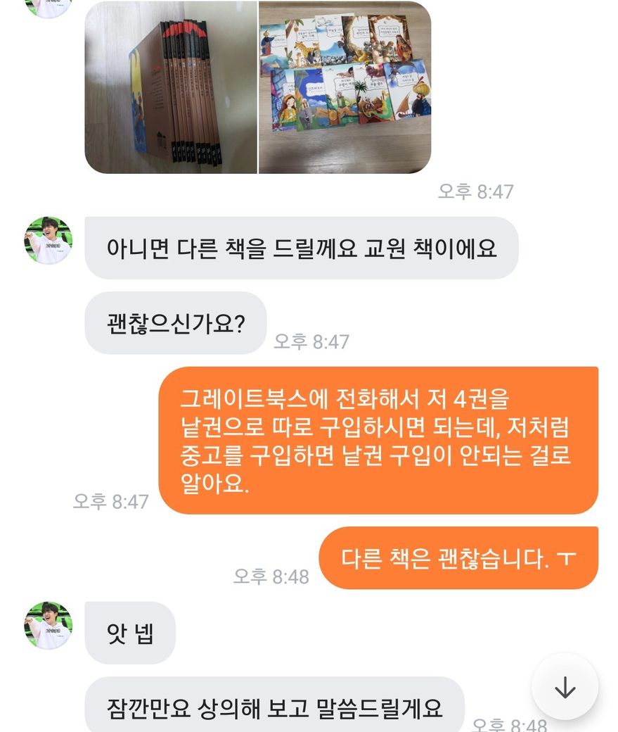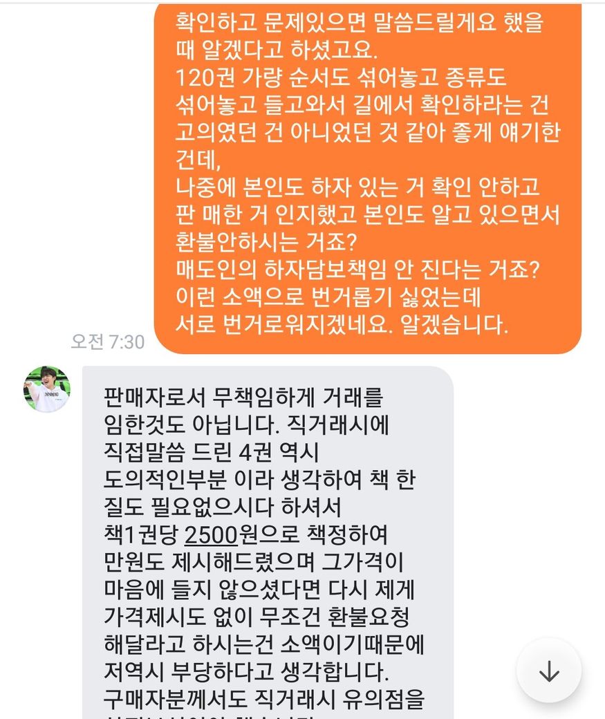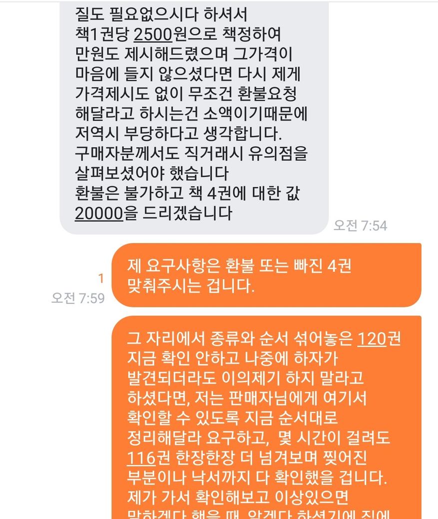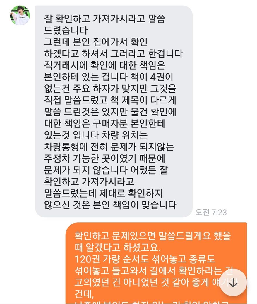 확인하시라길래, 마구 섞여있는 120권의 책을 길에서 확인하기가 쉽지 않아 집에 가서 확인하고 이상있으면 말씀 드리겠다 했고, 판매자도 알겠다고 했습니다.