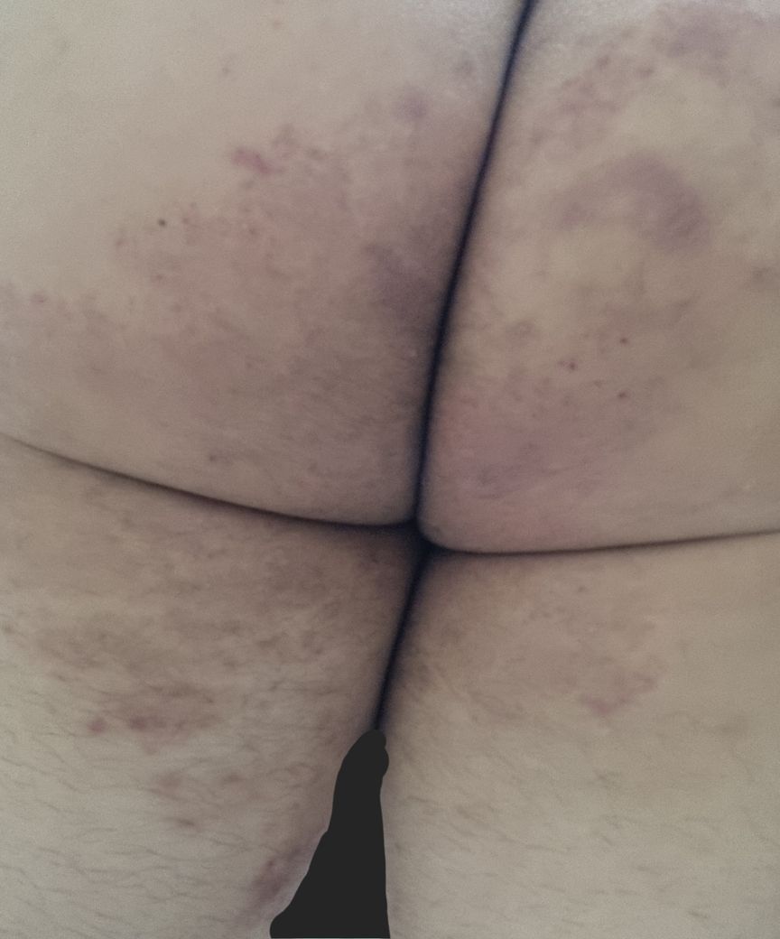 사진만 봤을 때는 완선(곰팡이균 감염)으로 생각됩니다.