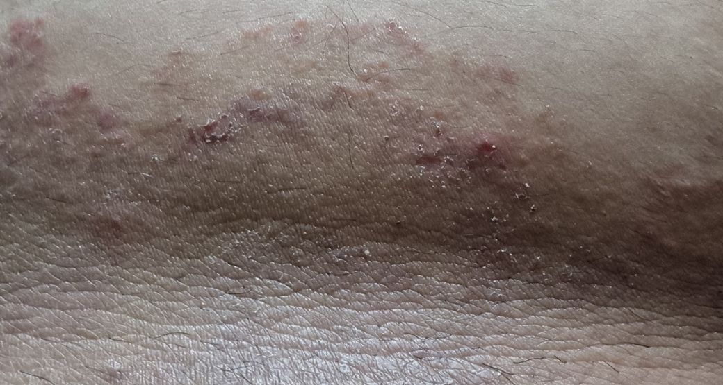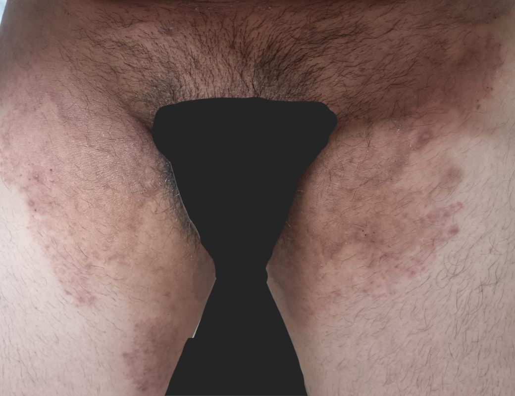 사타구니에 생기는 무좀이라고 보시면 됩니다. 다만 정확한 진단은 피부과 전문의가 육안으로 직접 보고 KOH 검사로 곰팡이균을 확진해야 가능합니다.
