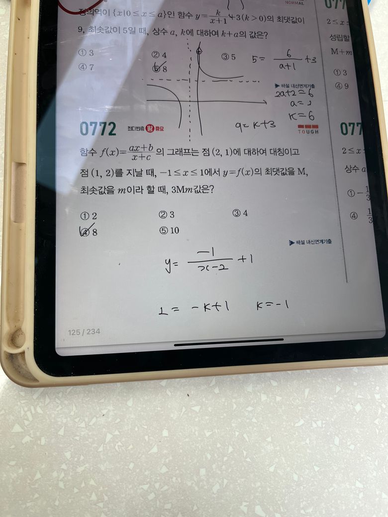 - 최대값과 최소값은 주로 점근선 근처에서 결정되므로, 이 구간에서 y의 최대값은 1에 근접한 값이 되고, 최소값은 이론적으로는 -∞에 근접할 수 있습니다.