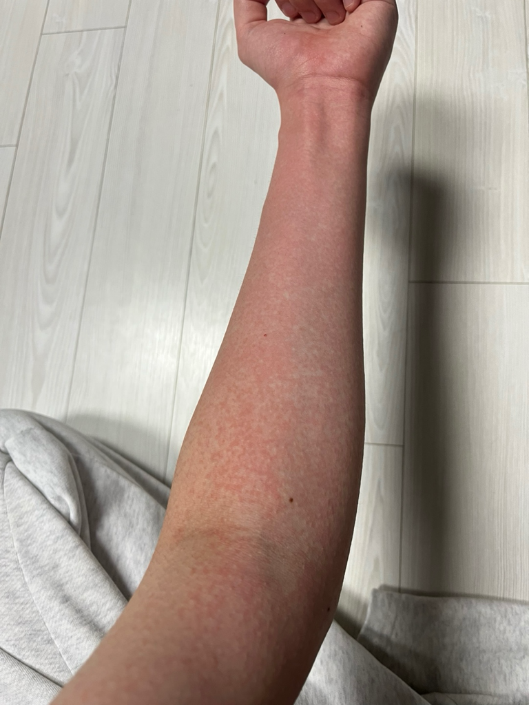 알레르기 증상일 가능성이 높으며 보다 정확한 원인 파악및 치료를 위해 피부과에 방문하여 꾸준히 치료를 받길 권장드립니다.