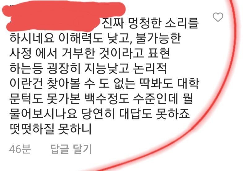 인스타그램에서 댓글로 내용이 상황에 맞지 않으니 정정해달라고 요청했습니다. 그랬더니 지능이 떨어진다, 대학도 못나온 개백수, 무식하다, 무당벌레와 사람이 대화를 못하는 것처럼 너랑나도 같은 경우다, 한국사람이 아니다, 등 개새끼,시발놈 같은 욕설만 사용 안 했을 뿐이지 악의적으로 고통주는 댓글들을 3일에 걸쳐 저를 태그해서 달았습니다. 그글을 쓴 사람은 신고해봐라. 신고가 가능한가라고 말하면서 아직도 괴롭힙니다. 올린사진은 다른 사용자에게 저에 대해서 평가까지 하는 댓글입니다. 해당 게시글은 좋아요가 5000개정도 눌린 게시글이며 게시글 작성자의 팔로워는 3.4만입니다.