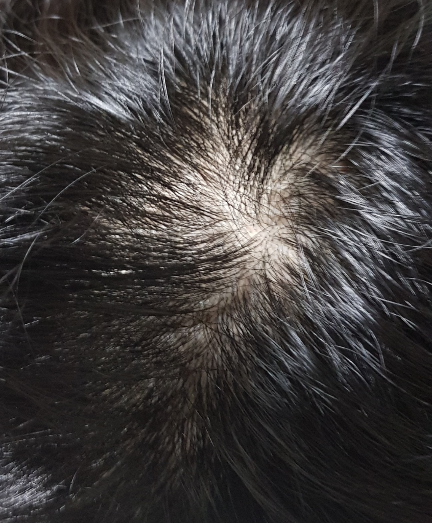 안녕하세요. 채홍석 의사입니다. 약간 탈모가 있네요. 현실적으로는 약물치료가 가장 손쉽습니다.