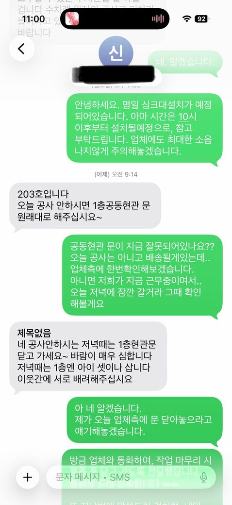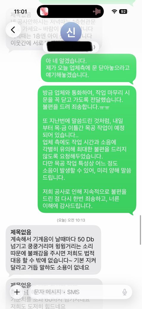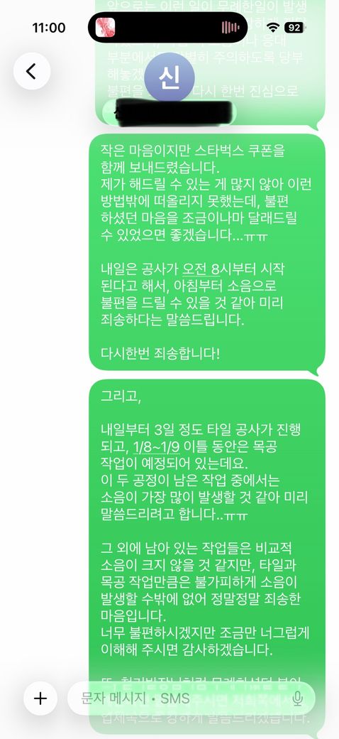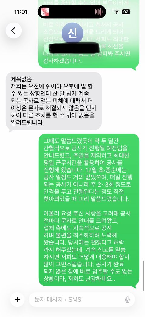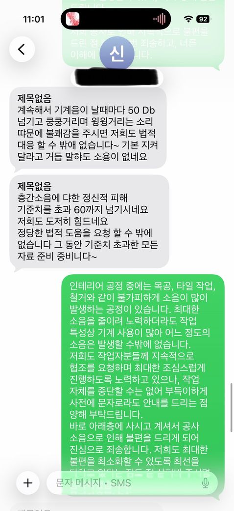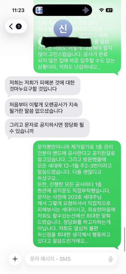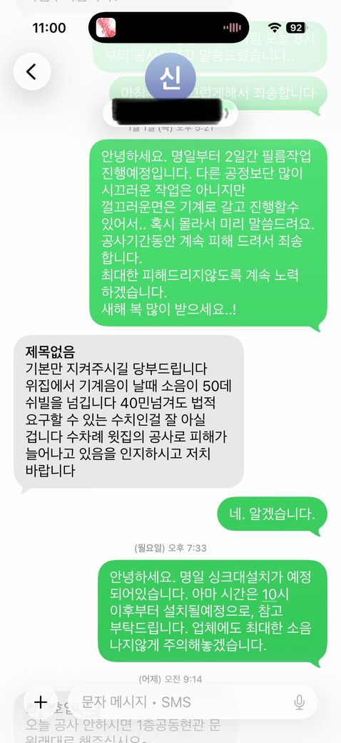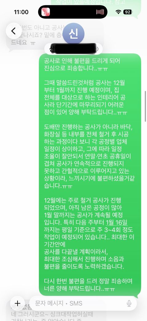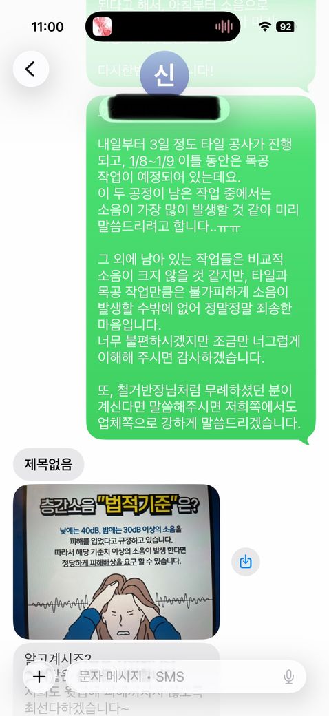 특히 어머님 아래층은 직접적인 영향이 있을 것 같아 해당 호수를 방문했을 때 더 주의를 기울였습니다. 당시에는 친절하게 괜찮다고 하셨고, 아이가 공부 중이라 공사 전에 문자를 주면 공사 날은 독서실을 예약하겠다고 하셔서, 모든 공사 시작 전에 아래층에만 모든 공정을 문자로 공지했습니다. 또한 건물 입구에 인테리어 일정을 매주 공사 전에 공지문으로 부착했습니다.