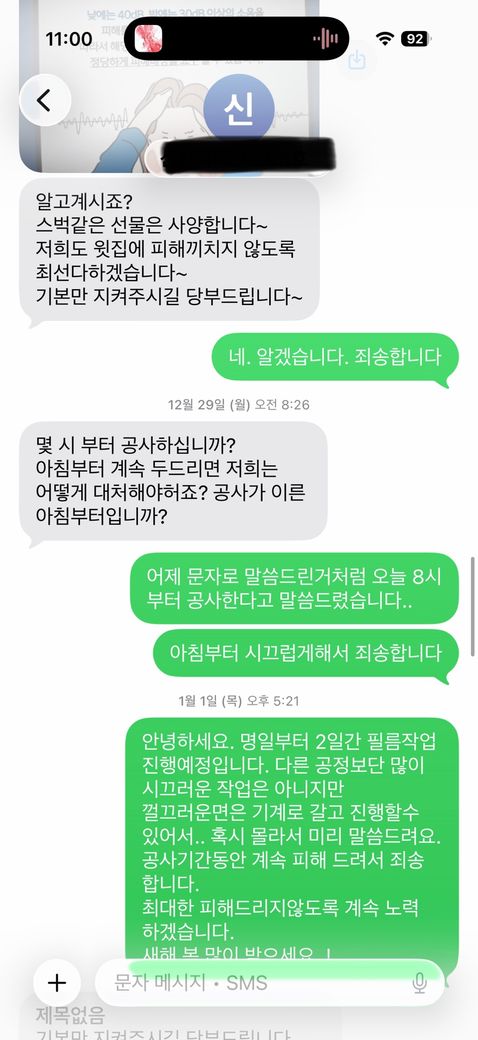 그런데 철거를 진행할 때 철거 기사님과 다툼이 있으셨고, 그 이후부터는 문자에서 처음의 친절한 태도는 보이지 않고 계속 거칠게 대응하고 있습니다.