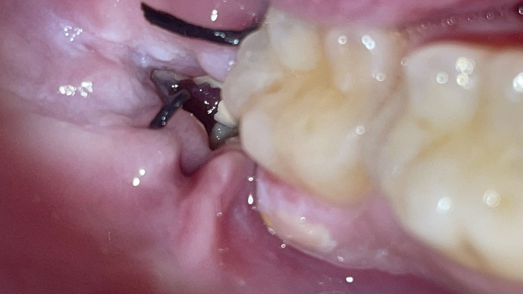 가운데 빨갛게 또는 약간 검게 보이는 부위는 혈병(피딱지)이 차 있는 것으로 이 혈병이 점점 잇몸조직으로