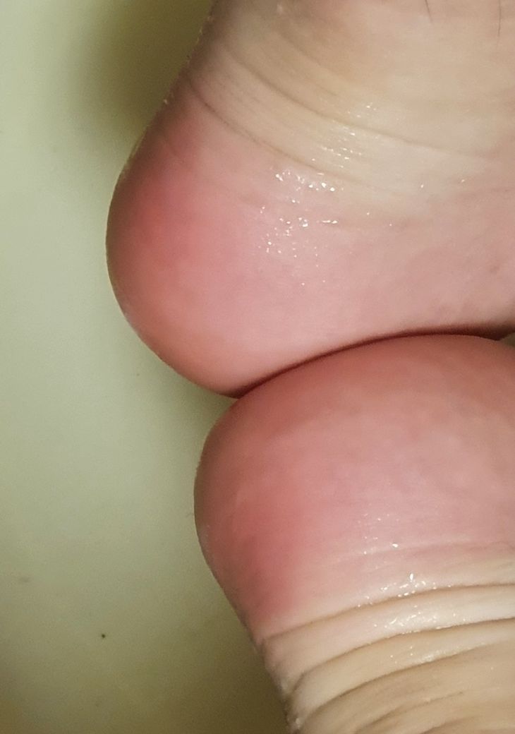사진이 잘 보일지 모르지만 발이 전체적으로 부었고, 발 뒤꿈치와 새끼발가락과 발날(?) 부분이 특히 빨갛게 올라와있고, 물에 담갔었던 발목 부분에도 빨갛게 보이네요.