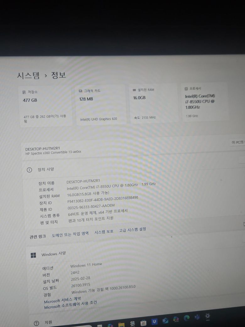 HP Spectre x360 Convertible 13-ae0xx 모델은 2017년 출시된 프리미엄 2-in-1 노트북으로, 현재 중고 시세는 상태에 따라 약 25만 원에서 50만 원 사이로 형성돼 있어요. eBay에서는 i7-8550U, 8GB RAM, 256GB SSD 사양 기준으로 약 50~70달러(부품용은 더 저렴)에 거래되고 있고, 국내 중고나라나 번개장터에서는 상태 양호한 제품이 30만 원대 중후반에 올라오는 경우가 많아요. 터치스크린과 360도 회전 힌지 덕분에 휴대성과 활용도는 좋지만, 내장 그래픽(Intel UHD 620)이라 게임용으로는 성능이 부족한 편이에요. 고사양 게임보다는 문서 작업, 영상 시청, 간단한 웹서핑에 더 적합하죠. 게임 위주로 사용하신다면, 중고로 판매하고 게이밍 성능이 더 좋은 모델로 교체하는 것도 괜찮은 선택일 것 같습니다!
