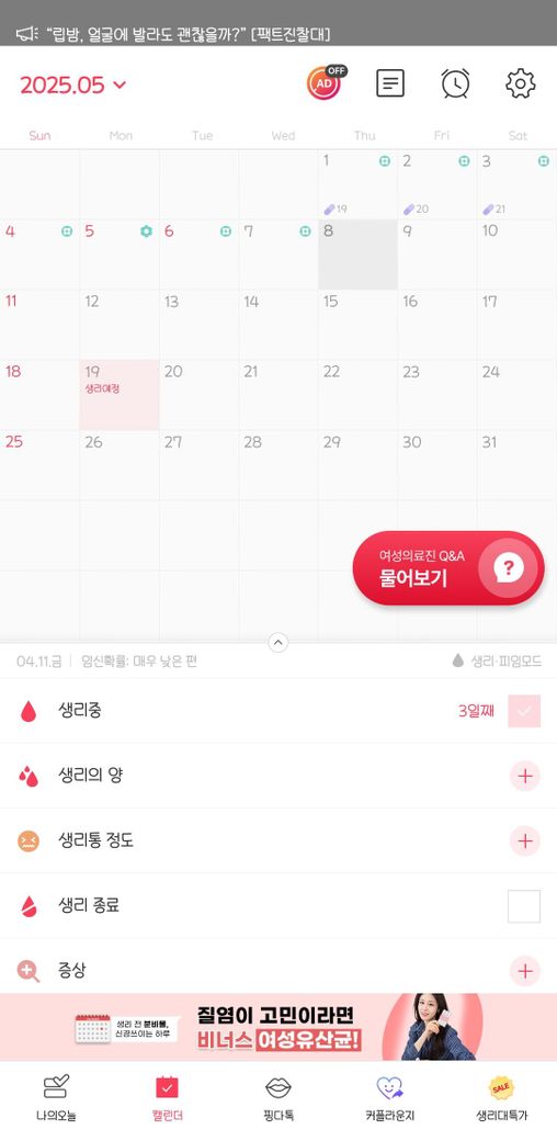 그랬더니 생리 기록앱에서는 제대로 복용한 걸로 안 쳐주는지 가임기랑 생리예정일이 이상하게 떠요 지금이 가임기라고 뜨네요...
