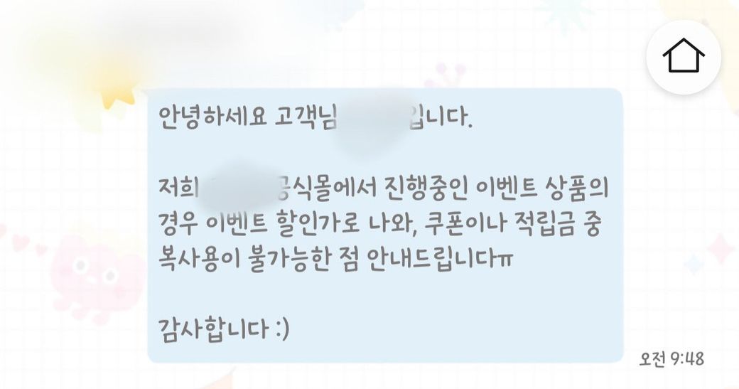 그리고 결제를 하던 중 결제창에서 쿠폰이 사용되지 않아 고객센터에 문의를 하니 이벤트상품은 적용되지 않는다는 답을 받았습니다.