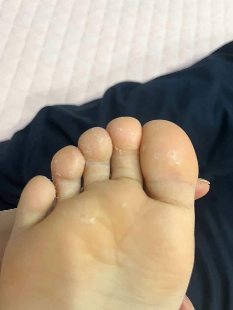 사진상 발가락 끝과 사이에 얕게 각질이 벗겨지는 양상이 반복되는 것으로 보이며, 통증이나 염증이 뚜렷하지 않고 주기적으로 발생한다는 점을 고려하면 각질박탈증 가능성이 가장 높습니다. 이는 땀이 많거나 마찰이 반복될 때 표피의 가장 바깥층이 얕게 떨어지는 현상으로, 물집 없이 얇게 벗겨지고 특별한 통증이 없는 것이 특징이며 계절적으로 반복되는 경우가 흔합니다.